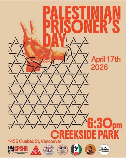 Hanna and the CPA will be front and centre this Friday, April 17th in Vancouver, at Creekside Park for Palestinian Prisoners’ Day.